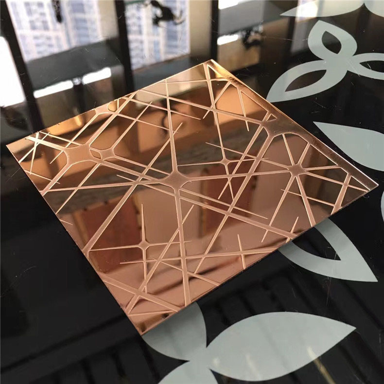 不锈钢蚀刻板是在不锈钢表面通过化学的方法,腐蚀出各种花纹图案。以8K镜面板、拉丝板、喷砂板为底板,进行蚀刻处理后,对物体表面再进行深加工,不锈钢蚀刻板可进行局部的和纹,拉丝,嵌金,局部钛金等各式复杂工艺处理,不锈钢蚀刻板实现图案明暗相间,色彩绚丽的效果。